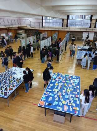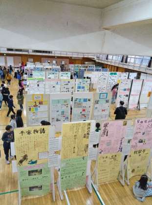 格技室で行われているて駒留ルネサンス(学習作品展)です。たくさんの作品が並んでいます。学び舎の小学生の作品も展示されました。