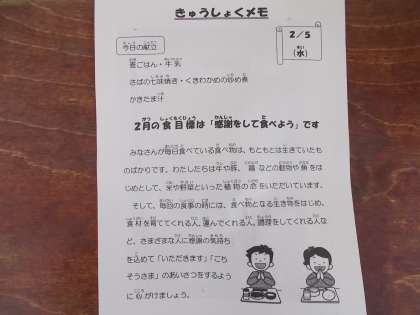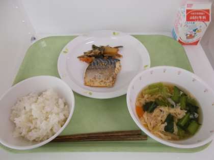 献立は、麦ごはん、牛乳、鯖の七味焼き、茎わかめの炒め煮、かきたま汁でした。