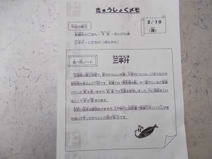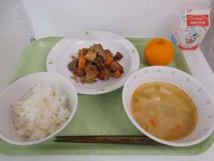 献立は、有機米のごはん、牛乳、きんぴら煮、三平汁、ぽんかんでした。