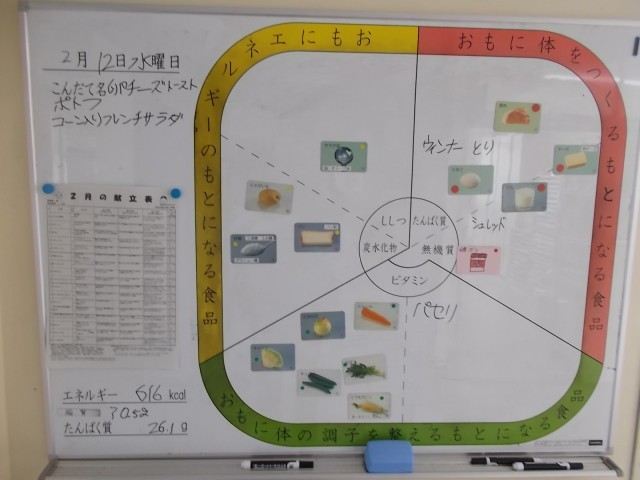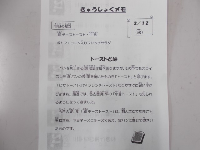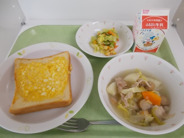 献立は、卵チーズトースト、牛乳、ポトフ、コーン入りフレンチサラダでした。