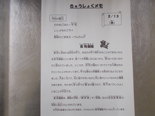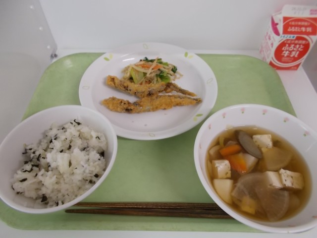 献立は、わかめごはん、牛乳、ししゃものフライ、野菜のごまあえ、けんちん汁でした。