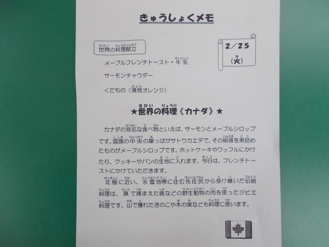 給食(2月25日) 公開日 2025/02/25 更新日 2025/02/25 給食 献立は、メープルフレンチトースト、牛乳、サーモンチャウダー、清見オレンジでした。本日は、★世界の料理《カナダ》★ でした。 +2