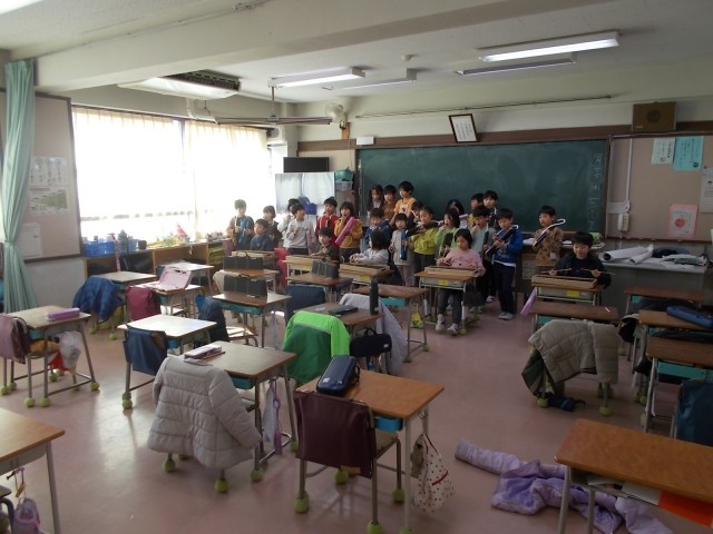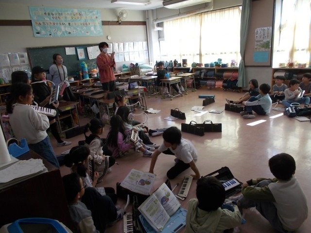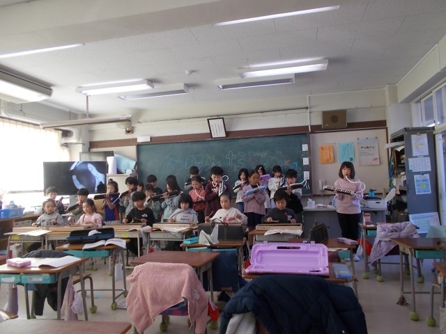 各学級、音楽専科教員を招いて『こぐまの二月』(作詞:平井 多美子/作曲:市川 都志春)の演奏をしました。