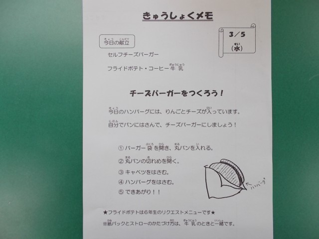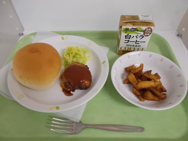 献立は、セルフチーズバーガー、フライドポテト、コーヒー牛乳でした。