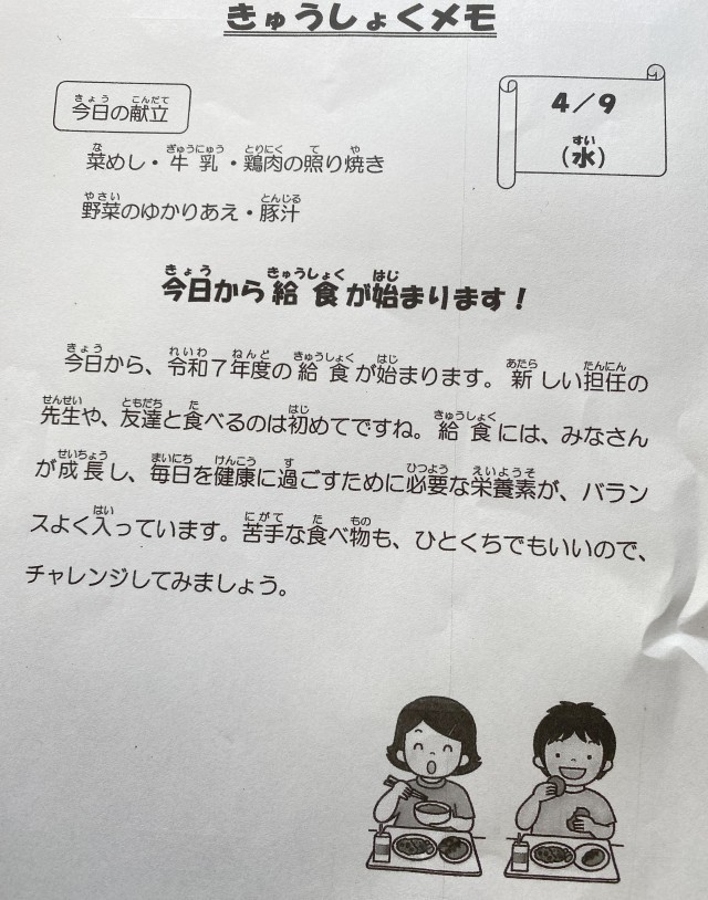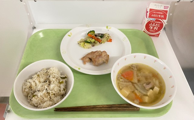 今日から給食が始まりました。メニューは、菜めし・牛乳・鶏肉の照り焼き・野菜のゆかりあえ・豚汁です。
