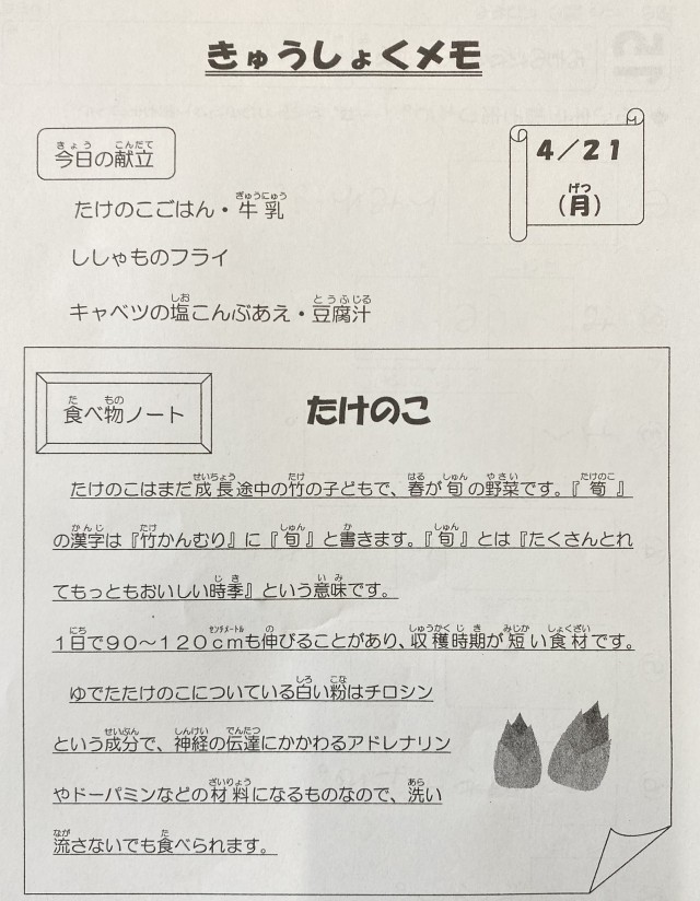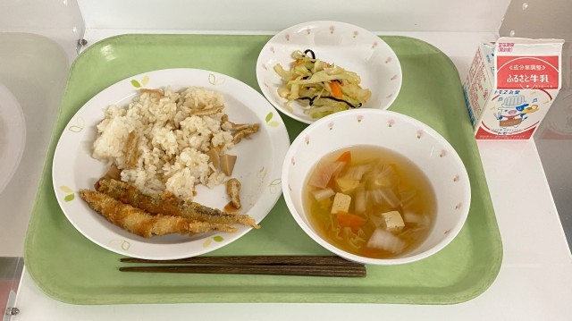 【今日の献立】たけのこごはん・牛乳・ししゃものフライ・キャベツの塩こんぶあえ・豆腐汁