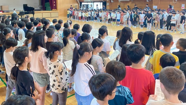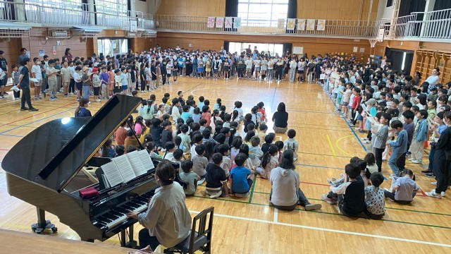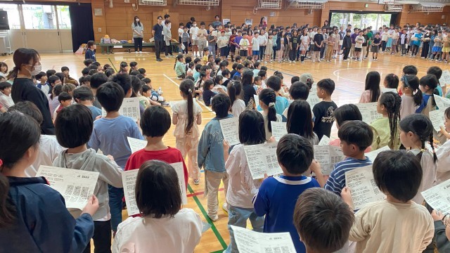 音楽朝会 公開日 2025/04/21 更新日 2025/04/21 今日のできごと まずはじめに全校児童で校歌を歌いました。次に、2年生から6年生の上級生が1年生に「ジャンプ」という曲をプレゼントしました。音楽の時間に練習した成果を発揮していました。