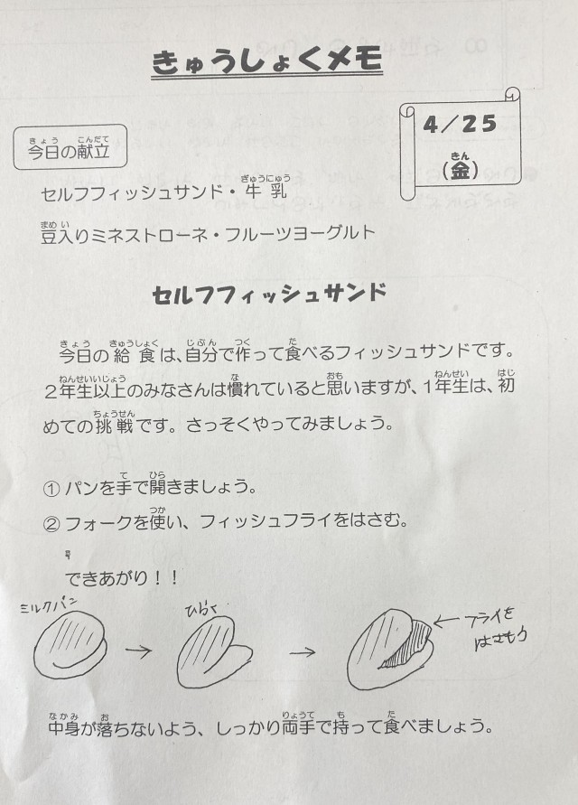 【今日の献立】セルフフィッシュサンド・牛乳・豆入りミネストローネ・フルーツヨーグルト