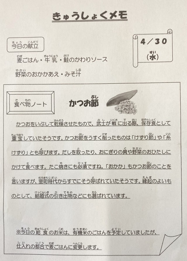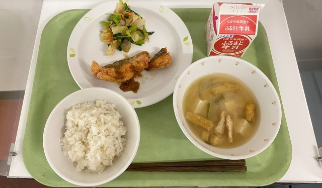 【今日の献立】麦ごはん・牛乳・鮭のかわりソース・野菜のおかかあえ・みそ汁
