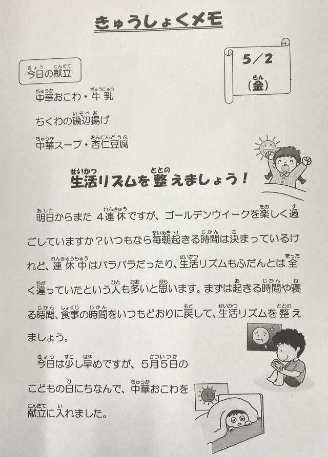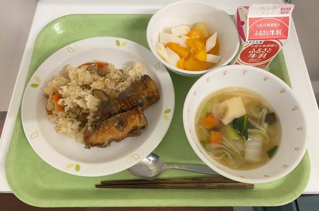 【本日の献立】中華おこわ・牛乳・ちくわの磯辺揚げ・中華スープ・杏仁豆腐