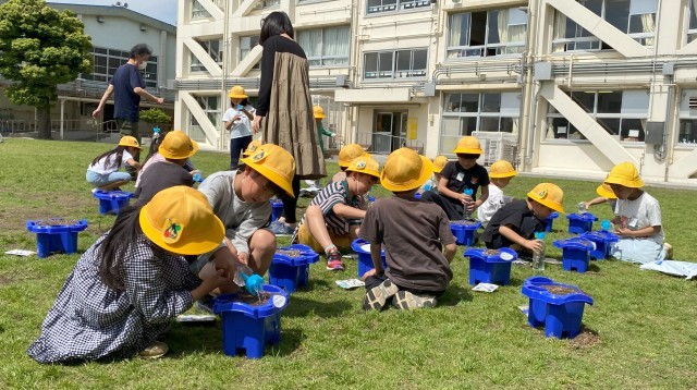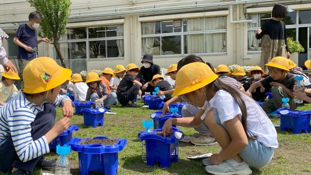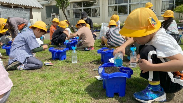 アサガオの種を植えます。鉢に土と肥料を入れて水を加えました。指先で土に6つ穴をあけて、準備完了です。