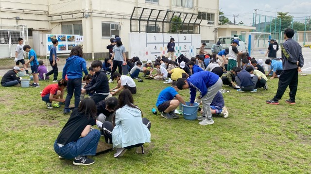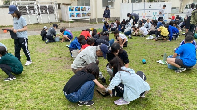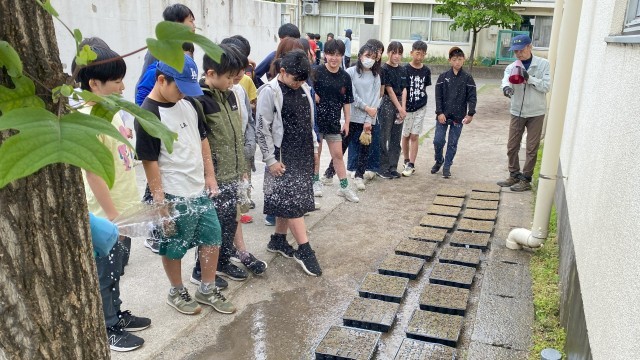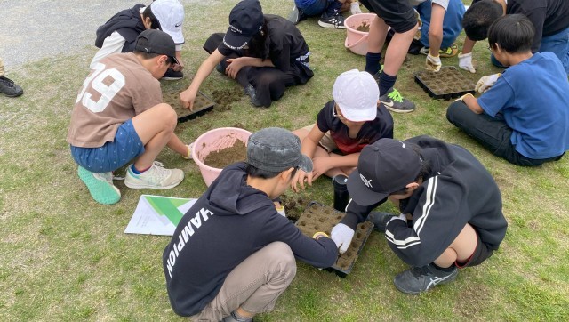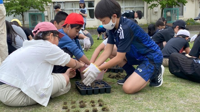 芝生のポット苗づくりについて、芝辰産業の方にご指導いただきました。子どもたちは3人一組になり、熱心に活動しました。これから苗を大切に育てていきます。次回、苗植えは6月に予定しています。