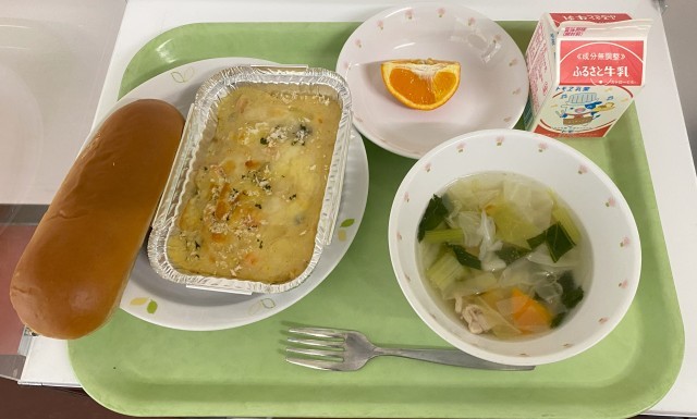 【今日の献立】黒砂糖パン・牛乳・豆乳入りポテトグラタン・野菜スープ・くだもの(セミノールオレンジ)