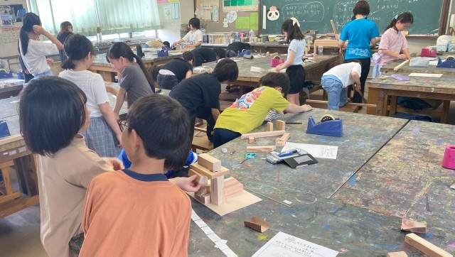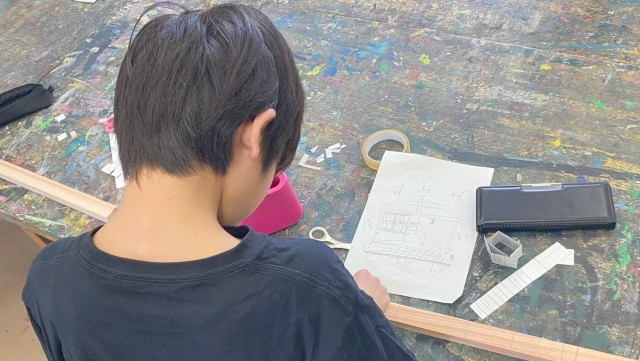「木から生まれた!」の木工作に取り組んでいます。作りたいものの設計図をかき、それをもとにして作っています。のこぎりや金づちの使い方にも慣れてきました。