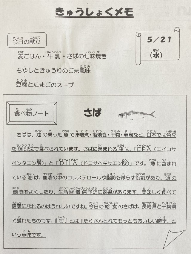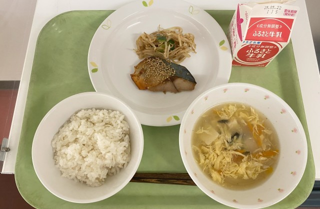 【今日の献立】麦ごはん・牛乳・さばの七味焼き・もやしときゅうりのごま風味・豆腐とたまごのスープ
