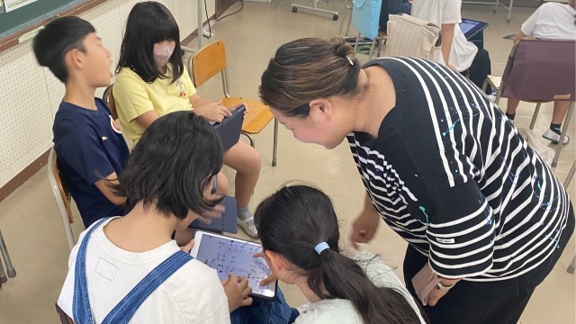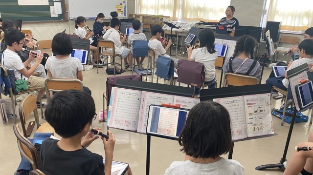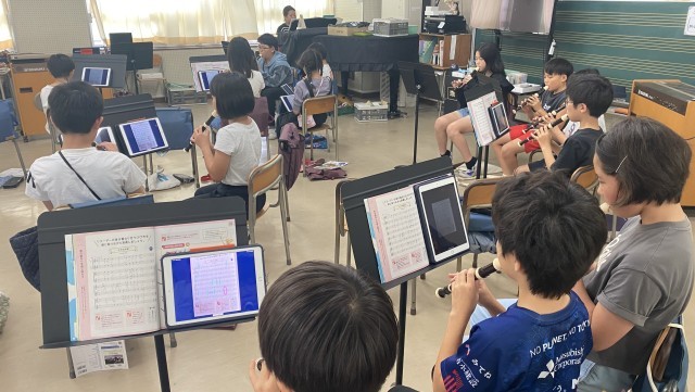 「音の重なりを感じ取ろう」の学習を進めています。『いつでもあの海は』の楽譜をタブレットで確認してから、歌声が重なり合う歌を聴き、自分たちも歌ってみたいという気持ちが高まりました。