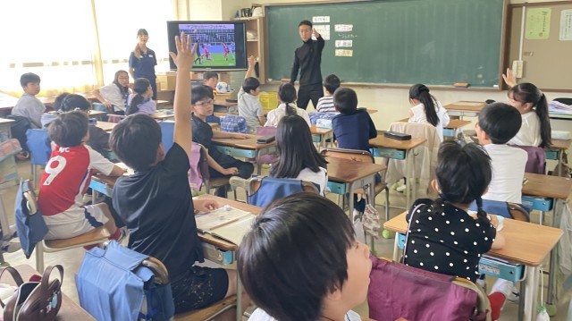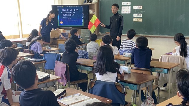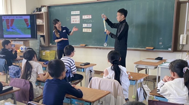 日本障がい者サッカー連盟(JIFF)の方をお招きして授業を行いました。はじめに障がい者サッカーの競技の種類やルールの違いを話していただきました。サッカーを『工夫して一緒に楽しむ』という大切な考え方や日常生活での工夫について学びました。最後に国際大会で獲得したメダルも見せていただきました。