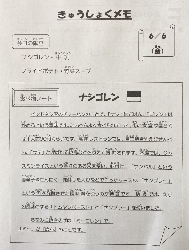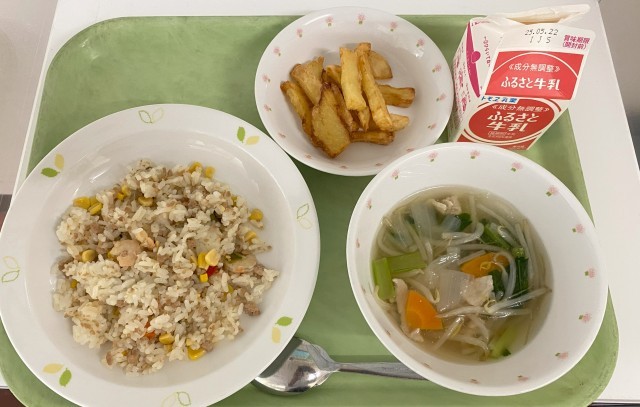 【今日の献立】ナシゴレン・牛乳・フライドポテト・野菜スープ