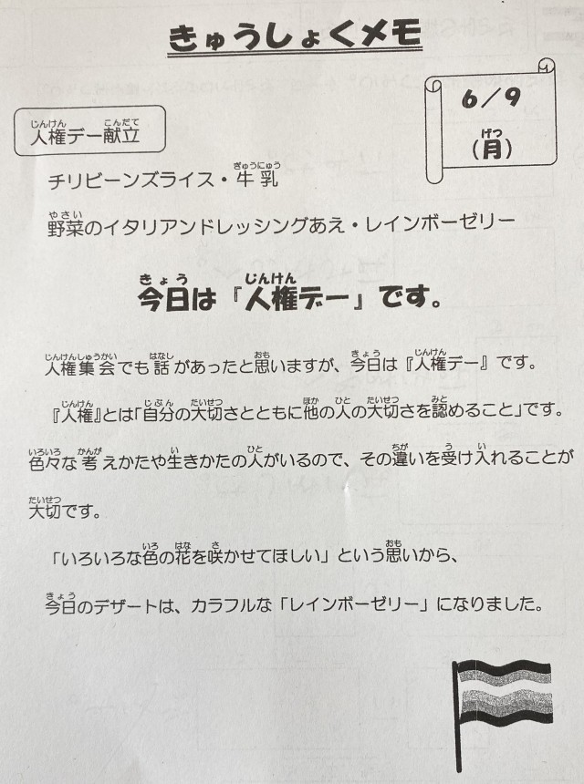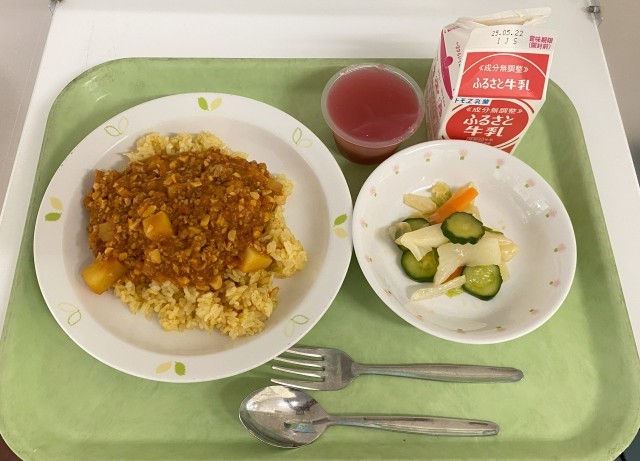【今日の献立】チリビーンズライス・牛乳・野菜のイタリアンドレッシングあえ・レインボーゼリー