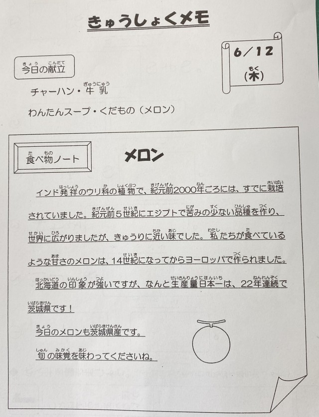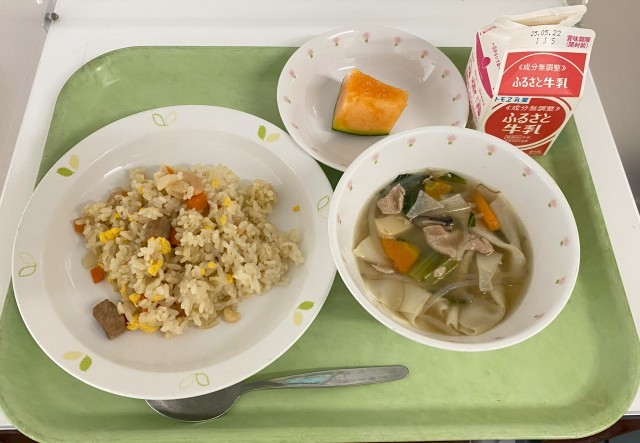【今日の献立】チャーハン・牛乳・わんたんスープ・くだもの(メロン)