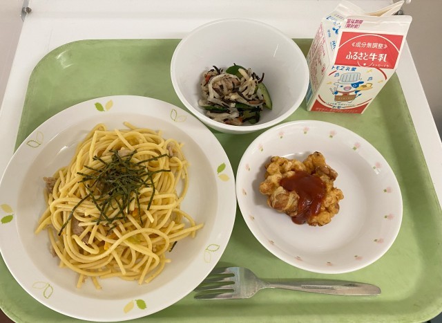 【今日の献立】和風スパゲティ・牛乳・大根とひじきのサラダ・大豆とウインナーのフリッター
