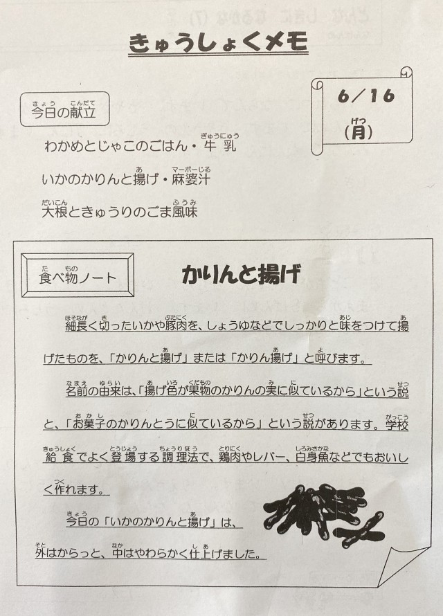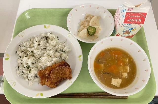 【今日の献立】わかめとじゃこごはん・牛乳・いかのかりんと揚げ・麻婆汁・大根ときゅうりのごま風味