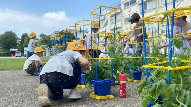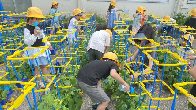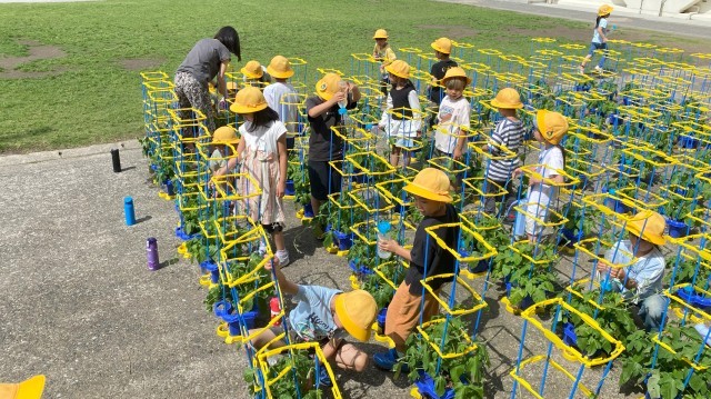 子どもたちが大切に育てているアサガオは、蔓を伸ばし大きく成長しています。水やりをしながら観察しました。