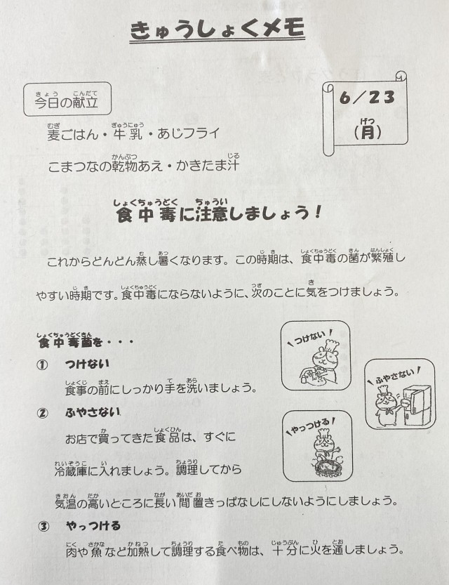 【今日の献立】麦ごはん・牛乳・あじフライ・こまつなの乾物あえ・かきたま汁