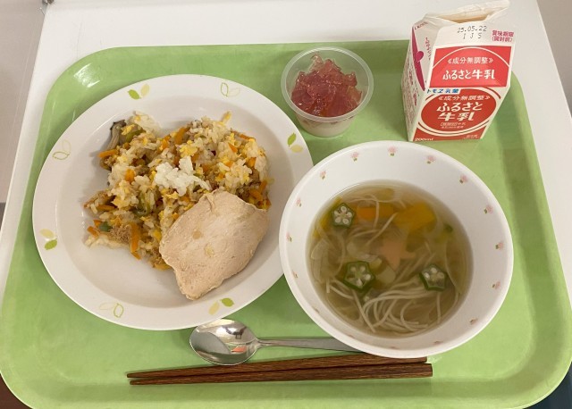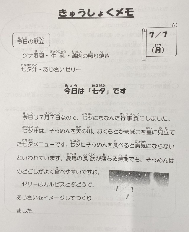 【今日の献立】ツナ寿司・牛乳・鶏肉の照り焼き・七夕汁・あじさいゼリー