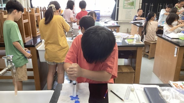 4年生 理科 公開日 2025/07/10 更新日 2025/07/10 今日のできごと 「とじこめた水」について学習しています。今日の問題は、『閉じ込めた水に力を加えると、水の体積はどのようになるだろうか。』です。子どもたちは閉じ込めた空気に力を加えたときや水で遊んだときのことを思い出しながら、意欲的に予想した考えを発表していました。「理科って楽しい!」とつぶやきながら実験していました。