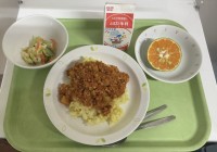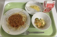 【今日の献立】スパゲティミートソース・牛乳・チーズ入りイタリアンサラダ・スイート...