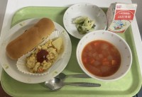 ぶどうパン・牛乳・スペイン風オムレツ風炒り卵・グリーンサラダ・ミネストローネ