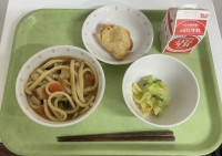 【今日の献立】ちゃんこうどん・牛乳・ツナとポテトのパリッと揚げ・野菜のごま風味