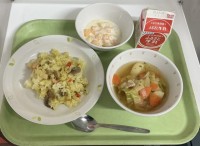 【今日の献立】チキンライス・牛乳・じゃがいものハニーサラダ・卵とトマトのスープ