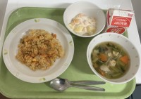 【今日の献立】チキンライス・牛乳・じゃがいものハニーサラダ・卵とトマトのスープ