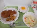 献立は、ココアパン、牛乳、鶏のから揚げレモンソース、コーンシチュー、おかしな目玉...