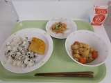 献立は、わかめごはん、牛乳、卵焼き、野菜のごまだれあえ、じゃがいものそぼろ煮でし...