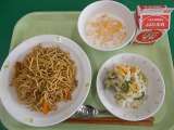 献立は、カレー焼きそば、牛乳、ツナサラダ、フルーツヨーグルトでした。