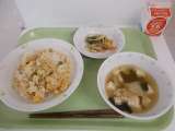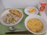 献立は、レタスとじゃこのチャーハン、牛乳、ジャンボ餃子、たまごスープ、バレンシア...