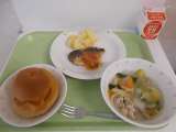献立は、黒砂糖パン、牛乳、鯵のエスカベージュ、コーン入り粉ふきいも、ヌードルスー...