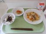 献立は、麦ごはん、牛乳、ひじきのふりかけ、じゃがいものそぼろ煮、じゃこともやしの...