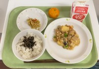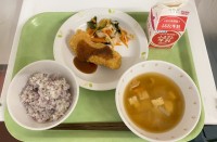 【今日の献立】ゆかりごはん・牛乳・チキンカツ・わかめサラダ・豚汁