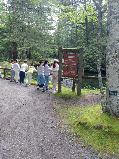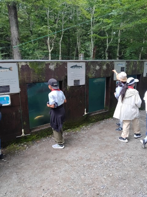残念ながら昼食やアイスクリームは、バスの中で食べて、さかなと森の観察園に向かいました。ここでは、ニジマスやヤマメなどの魚が池にいて、えさやりをしたり資料館に入って学習したりしました。