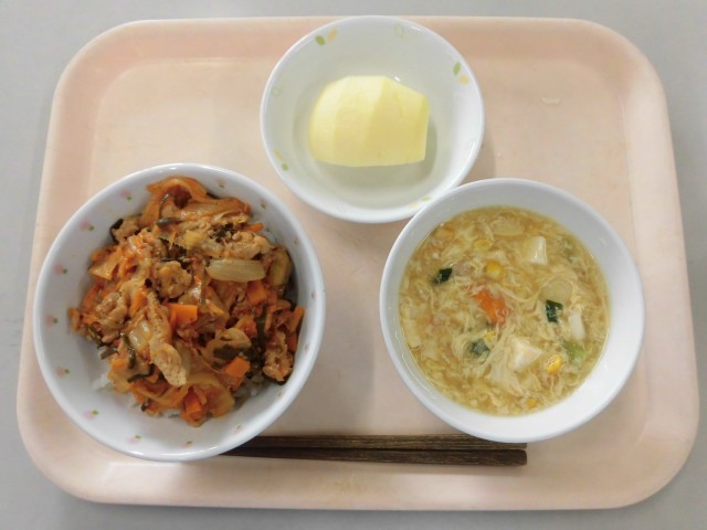 給食の『キムチ丼』は見た目は赤くて辛く見えますが、辛さ控えめの甘めのキムチを
