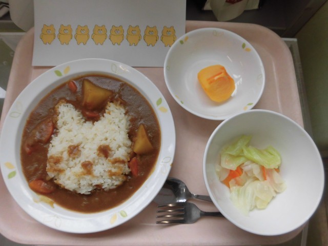 今日は図書館とのコラボメニューです。「カレーのひみつ」と「ノラネコぐんだんカレーライス」の