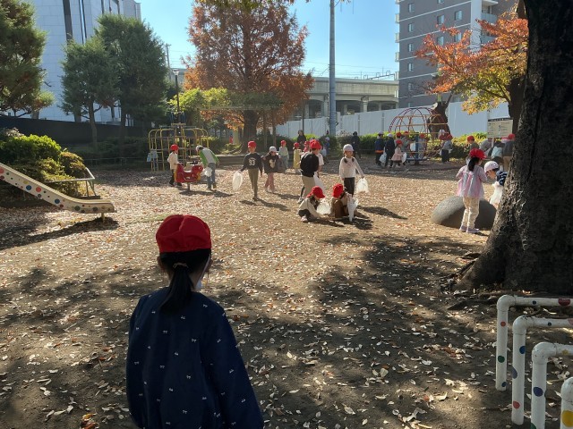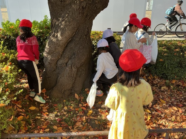 公園には、赤やオレンジ、黄色など、色とりどりの葉が落ちていました。子どもたちは嬉しそうに拾ったり遊んだりしました。音や匂いからも秋を感じている様子でした。