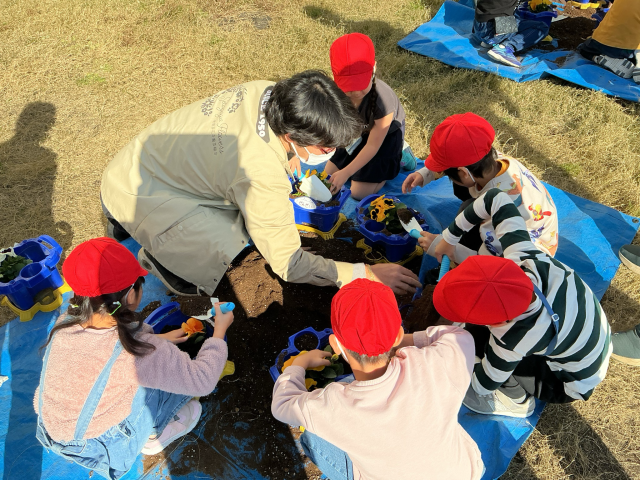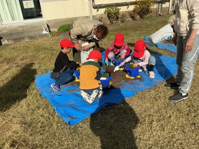 世田谷花卉園芸組合の方々が来てくださり、パンジーの花植えをしました。