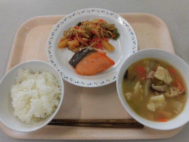 焼き魚、漬物だけでした。現在の給食では、栄養価が足りないので、きんぴらや汁物をつけています。