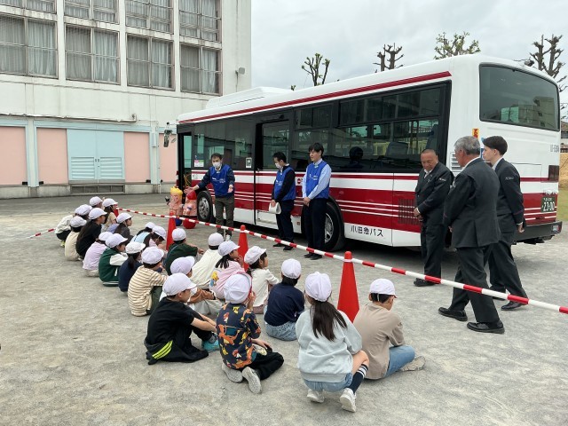 動画を見て道路の渡り方を学び、一人ひとりテストをして確認しました。校庭では本物のバスを使って、死角や内輪差について学びました。