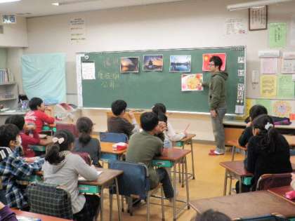 4年2組は中国の留学生でした。中国語のあいさつ、指による数字の表し方を教えてくださいました。最後には、子どもたち一人一人の名前を中国語で読んでくださいました。子どもたちは、自分の名前を中国語で読んでもらえて、とても喜んでいました。あいさつは、授業後も盛んに言い合っていました。